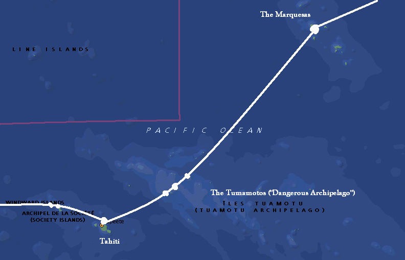 The Marquesas to Tahiti, via Tuamotus. About 640 nm. | 12 Apr '04 | 3 May '04. After a quick three day passage from the Marquesas, we cruised through four of the Tuamotus - enchanting atolls with motus on their perimeters. Then an overnight to Tahiti, the crossroads of the South Pacific, and a Mecca for many cruisers. | ||