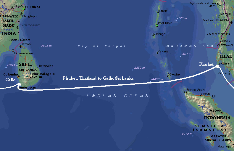 Phuket to Sri Lanka. About 1100 nm. Changed to Phuket to Cochin, India 1500 nm. |