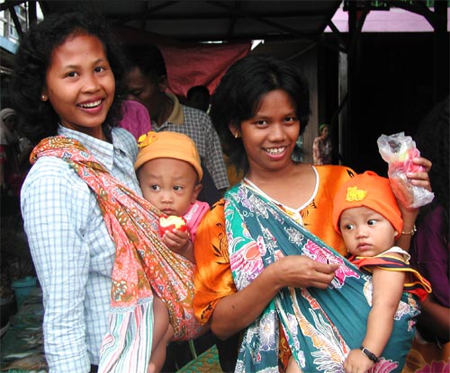 Indonesians of all ages love to smile and be photographed. Here two mothers with similarly dressed newborns catch us in the market to be photgraphed.