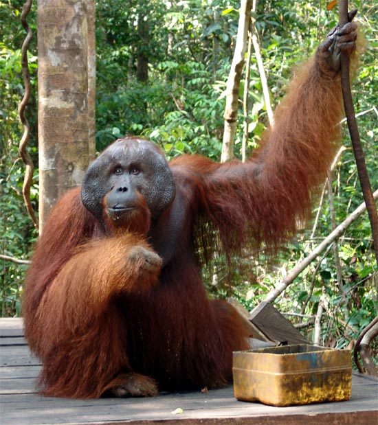Our first introduction to the orangutans was at the pier where we tied up our riverboat. Just upstream was a small speedboat, with an orangutan aboard who had untied the boat. He had obviously seen humans driving the boats, as he would go aft to the engine, maybe paddle the boat, but then run forward to the wheel, which he would try to steer. He could not quite figure out how to make the boat move under power, but he was trying hard. I believe if we had taught him how to turn it on, he could have taken it for a spin!