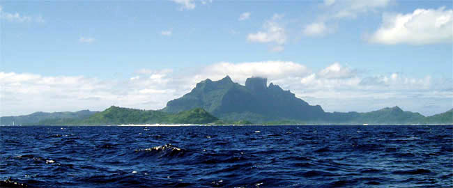 "Bali Hai will call you ..." This is the famous visage of Bora Bora, which James Michner call the most beautiful island in the world. Our crew Christy caught this shot from just south of the sole pass through Bora Bora's reef. We don't know which is more beautiful, Bora Bora or Moorea, but we were glad we visited both.